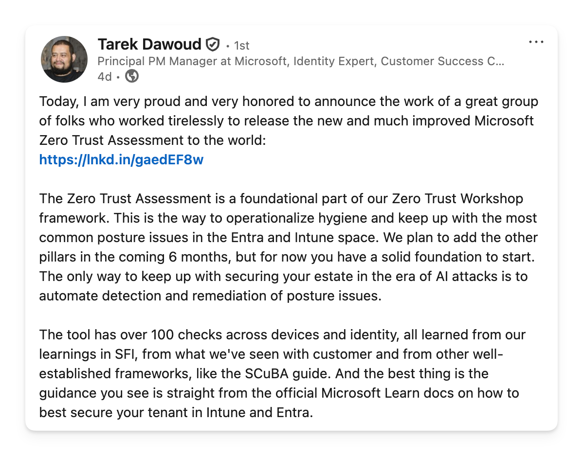 Speaking of big news, this week was special for me with the launch of the new Zero Trust Assessment. I was part of the team that built this, and it feels really good to finally share it.