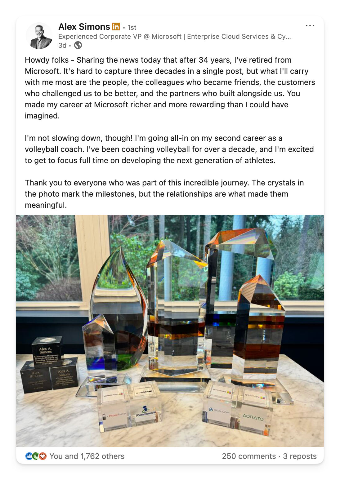 To give you an idea of his “customer-obsessed” mindset: back in 2017, long before I joined Microsoft, I started following Alex on Twitter. Out of the blue, he sent me a DM offering to help if I ever ran into trouble with Azure AD. That wasn’t an anomaly; it was the culture he built. While we’re sad to see him go, please join us in wishing him incredible fun and success in his “second career” as a volleyball coach! 🏐