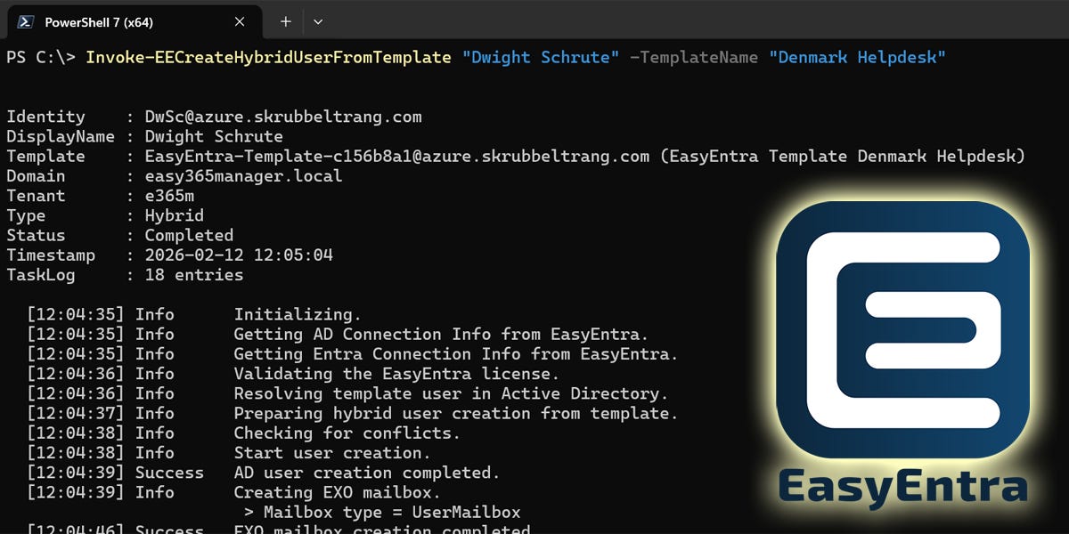 EasyEntra’s new Invoke-EECreateHybridUserFromTemplate CmdLet changes that:
