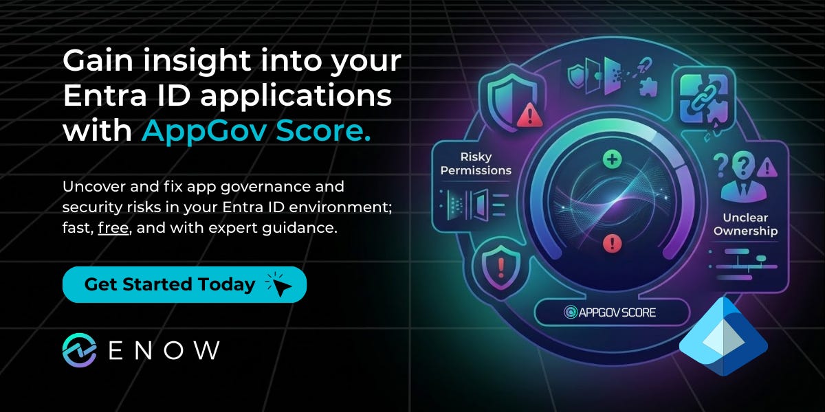 ENow AppGov Score evaluates your Entra ID application environment against 24 governance checks and benchmarks your governance posture. Identify risky permissions, orphaned apps, role assignments, and credential risks that require review. Get your AppGov Score to see where your environment stands and access free community resources for practical guidance. 🛡️🔍