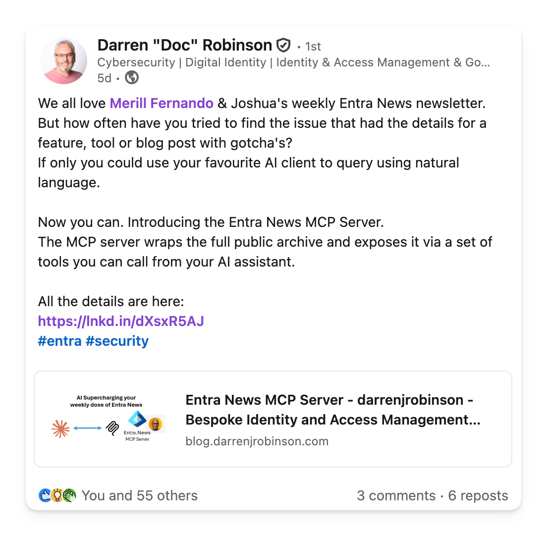 There’s plenty from the community as well. One highlight is the Entra News MCP Server created by fellow Aussie Darren ‘Doc’ Robinson, an incredibly useful way to tap into the collective knowledge of the Microsoft Entra community.